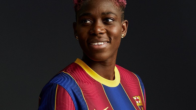 Oshoala is seen in one of Barcelona's promotional photos rocking the new strip.